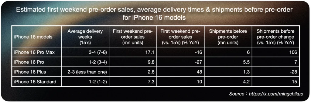 La domanda per iPhone 16 Pro e Pro Max è inferiore alle aspettative, nonostante Apple fosse molto ottimista sulle prospettive del Pro Max prima dell’inizio dei preordini (rispetto al 15 Pro Max).