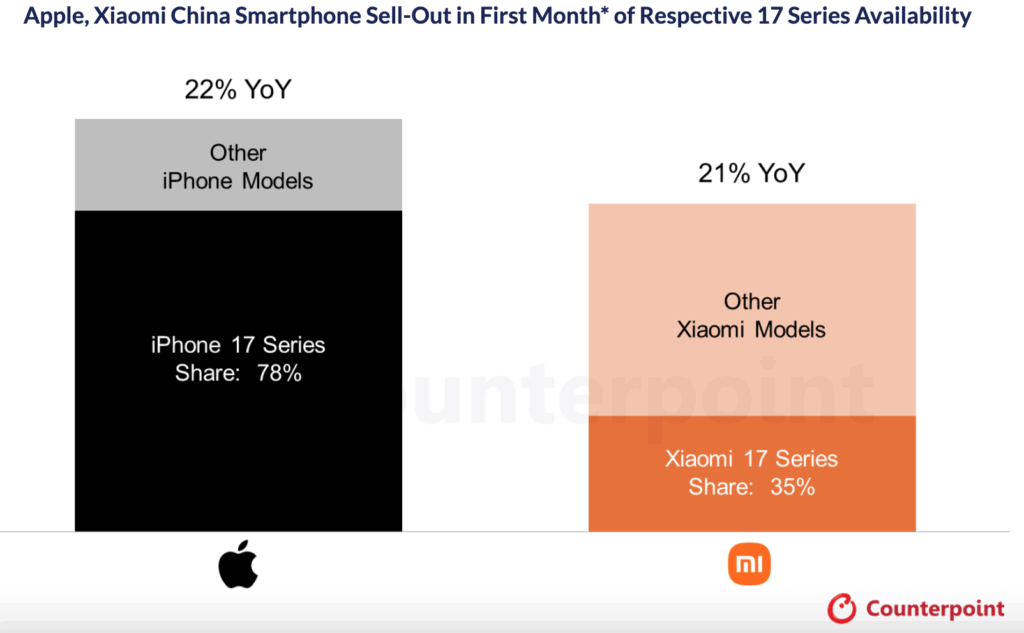 I dati di sell-out del primo mese per gli iPhone 17 e la serie Xiaomi 17 mostrano che i due flagship sono stati i principali motori della crescita dei rispettivi produttori nella fase iniziale delle vendite. Secondo il China Weekly Smartphone Sell-Out Tracker di Counterpoint Research, Apple e Xiaomi hanno registrato un andamento quasi sovrapponibile, con vendite in aumento del 22% e 21% su base annua.