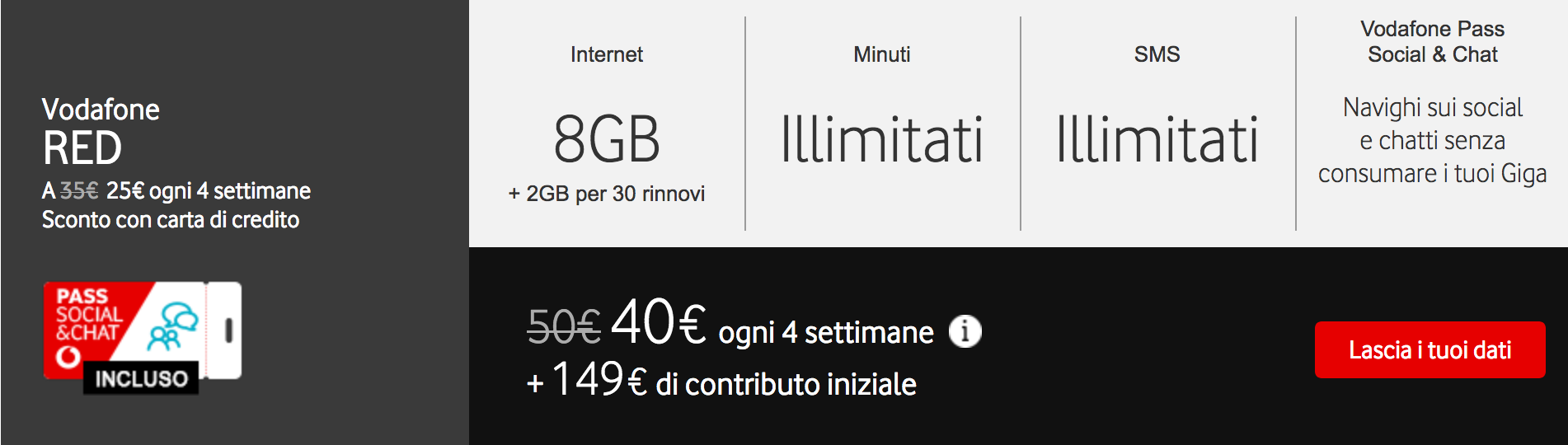 Se invece si vuole qualche cosa di più del telefono, c’è il piano Vodafone Red che con 40 euro ogni 4 settimane e un contributo iniziale di 149 euro dà diritto a minuti ed Sms illimitati e 8 GB di Internet.