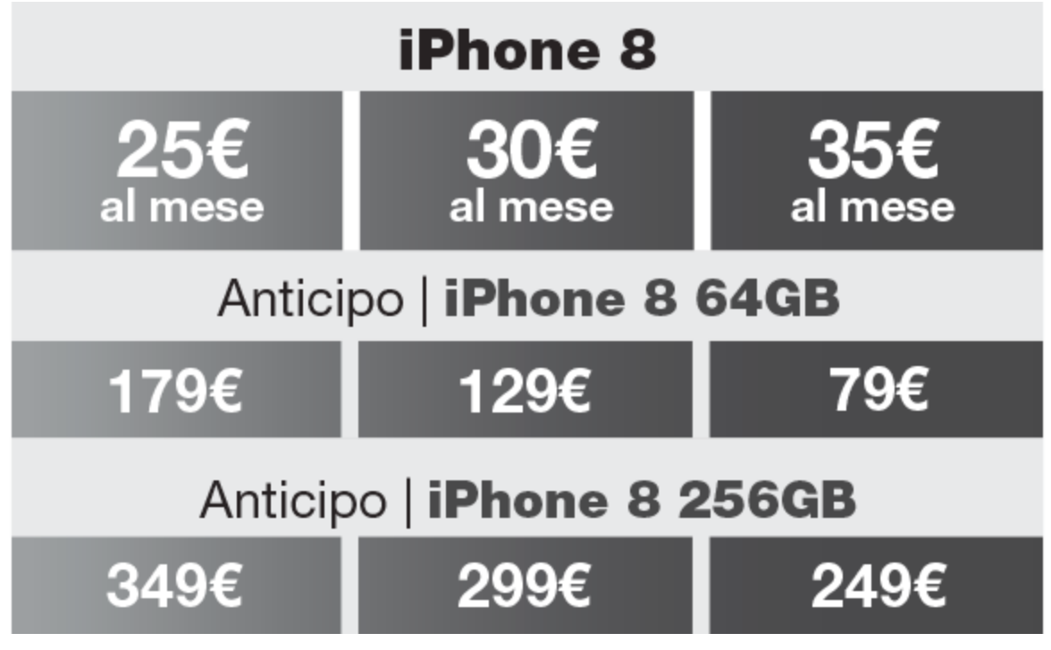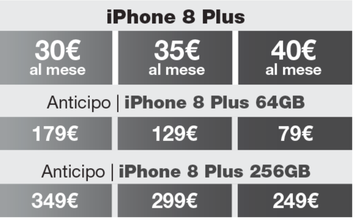 L’offerta prevede un anticipo all’acquisto (che parte da un minimo di 119 euro) e 30 rate mensili che partono dai 23,99 euro dell’iPhone 8 da 64 GB e crescono a seconda del prezzo del modello acquistato.