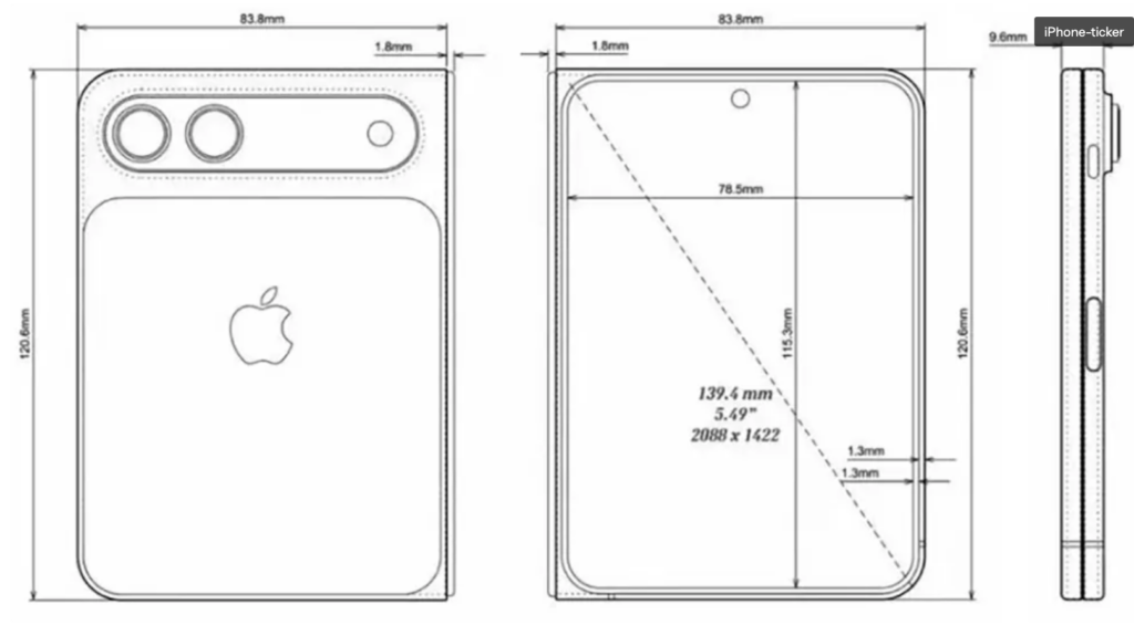 Secondo quanto riportato da iPhone-ticker, sarebbero emersi alcuni schemi tecnici che mostrano le dimensioni del presunto iPhone Fold. Da queste informazioni emerge chiaramente un approccio diverso rispetto agli attuali foldable Android. Apple non punterebbe su un display esterno simile a quello di uno smartphone tradizionale, ma su un formato più compatto e vicino a un rapporto quasi quadrato.