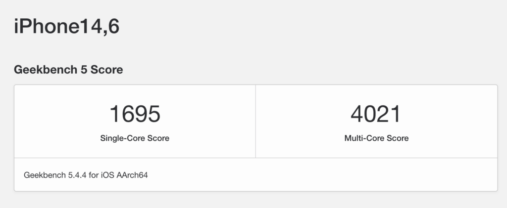 La scorecard di Geekbench per l’SE (2022) conferma una punteggio di 1.695 nel test single-core, paragonabile alla serie iPhone 13 e 4.021 punti nel reparto multi-core, un dato questo leggermente inferiore rispetto agli iPhone più premium.