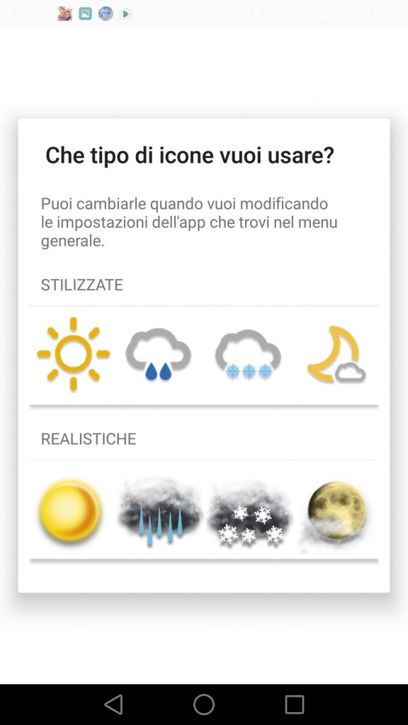 L’app di 3BMeteo è già disponibile su Google Play. La versione per Android pesa 20,16 MB e conta al momento più di un milione di download. Al primo avvio l’app contente di scegliere fra icone stilizzate e realistiche. In ogni momento, entrando nel menu, è possibile modificare la propria scelta.