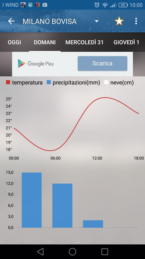 Insieme alle icone e ai dati numerici, l’app di 3BMeteo mostra i grafici dell’andamento di temperatura e precipitazioni (pioggia e neve).
