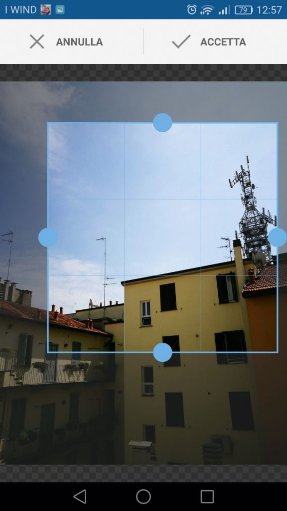 Dopo lo scatto, l’app permette di tagliare l’immagine per dare risalto al cielo o a un particolare. La scelta delle proporzioni è libera.