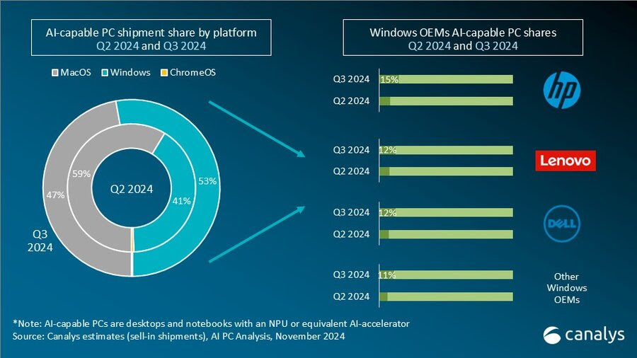 Ishan Dutt, Principal Analyst di Canalys, ha evidenziato l’avanzamento delle tecnologie per i PC con capacità AI nel Q3 2024, con modelli come i Copilot+ equipaggiati con chip Snapdragon della serie X che hanno completato il loro primo trimestre di disponibilità. Inoltre, AMD ha introdotto i prodotti Ryzen AI 300 e Intel ha lanciato la sua serie Lunar Lake. Tuttavia, entrambi i fornitori di chipset x86 attendono ancora il supporto per Copilot+ da parte di Microsoft, previsto entro questo mese, per rendere pienamente operativi i propri prodotti.