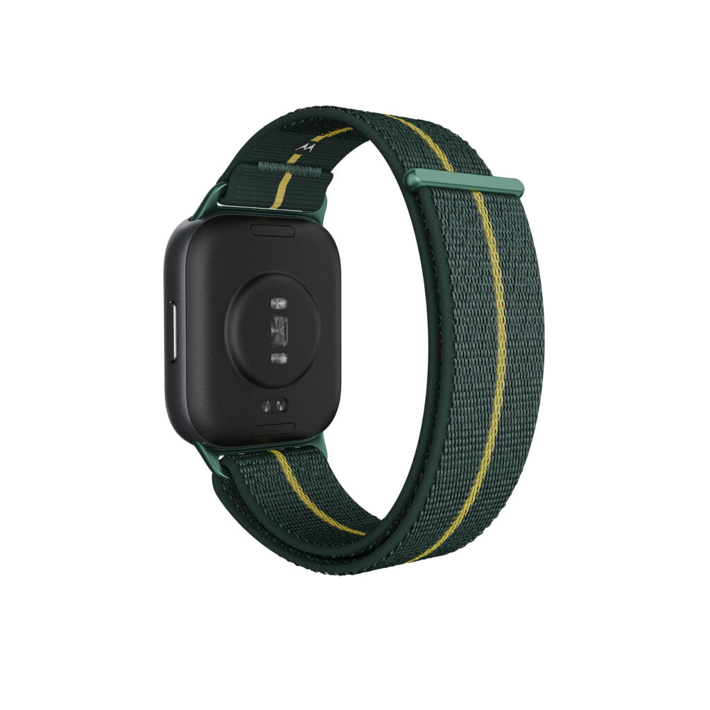 Moto watch fit è anche compatibile con cinturini di terze parti da 22 mm, quindi gli utenti possono personalizzare facilmente il proprio look, sia con il cinturino nella sfumatura Pantone Trekking Green, sia con un’ampia selezione di cinturini compatibili.