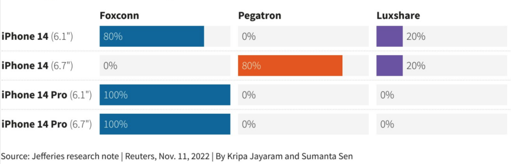 Dando uno sguardo invece a chi produce iPhone (si veda la tabella qui sopra), vediamo che la linea produttiva del modello base è già sufficientemente diversificata, mentre i modelli Pro sono realizzati unicamente da Foxconn a Zhengzhou, stabilimento che, con circa 200.000 lavoratori che producono solo iPhone, si è guadagnato il soprannome di “iPhone City”.