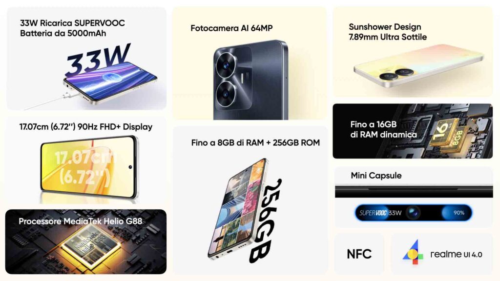 Il nuovo arrivato si posiziona in un segmento strategico, quello che accoglie i dispositivi intorno ai 200 euro, e denominata tradizionalmente come la “pancia del mercato”, quel target che restituisce un gran numero di pezzi venduti ed è un punto di passaggio obbligato per tutti i produttori. Fare bene qui significa riuscire a spiccare il volo per lanciare modelli di fascia più alta. Realme C55 è uno smartphone piacevole, con un grande display, una capiente batteria e un buon reparto hardware. La novità più succulenta è pero incarnata dalla “Mini Capsula” un’isola posta intorno alla fotocamera frontale e che incorpora alcune informazioni come lo stato della carica e di alcune notifiche. Qualcosa di già visto nel mondo Apple ma che Realme porta su un prodotto alla portata del grande pubblico. Realme C55 arriva sul mercato in due versioni di memoria, da 6/128 GB (oggetto di questo test) e da 8/256 GB, con prezzi che oscillano tra 219 e 249 euro con sconto di 20 euro per la fase di lancio. Di fatto Realme C55 è acquistabile con meno di 200 euro.