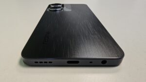 Il design di Realme C55 è classico ma piacevole. Bella la cornice piatta della scocca, che offre un ottimo grip e dona all’insieme una certa eleganza. Elegante la finitura della cover, con linee sfuggenti e leggermente in rilievo. La parte posteriore è caratterizzata dalla generosa isola tecnica che ospita le fotocamere: ci sono due grandi oblò, appena sporgenti rispetto al profilo, compresi in una porzione lucida, che contrasta con la finitura satinata del guscio posteriore. Il perimetro è pressochè sgombro, salvo per la presenza del carrellino porta Sim sul lato sinisto e di tutte le connessioni su quello inferiore.