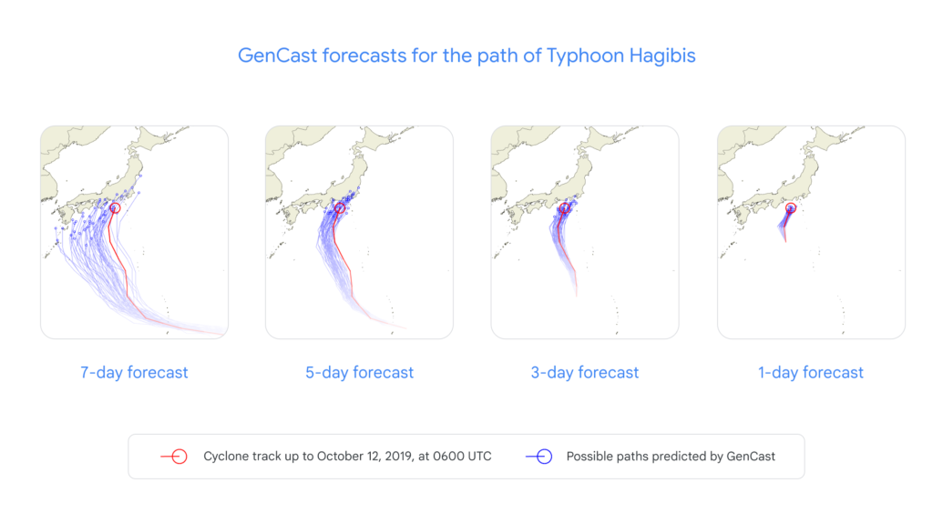 Google ha incaricato GenCast di prevedere il percorso del tifone Hagibis, che ha colpito il Giappone nel 2019. Come si può vedere dal grafico qui sotto, il percorso seguito dal tifone in rosso, in blu sono i possibili percorsi previsti dal modello AI di Google. A 7 giorni di distanza, sono piuttosto ampi, ma si restringono sul percorso effettivo man mano che il tifone si avvicina all’atterraggio.