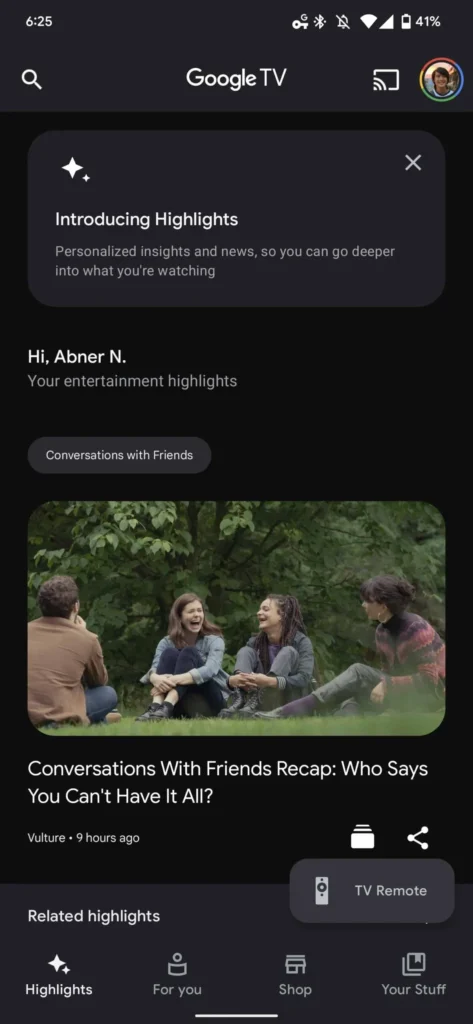 Naturalmente, la principale novità di questo aggiornamento di Google TV per Android è l’arrivo di Highlights in una scheda dedicata. In particolare consentono di visualizzare video di YouTube, ma anche articoli relativi ai propri contenuti preferiti (notizie, recensioni, ecc.). Questi articoli vengono aperti tramite schede personalizzate su Google Chrome ed è possibile visualizzare ulteriori In evidenza tramite un comando aggiunto accanto all’icona di condivisione.
