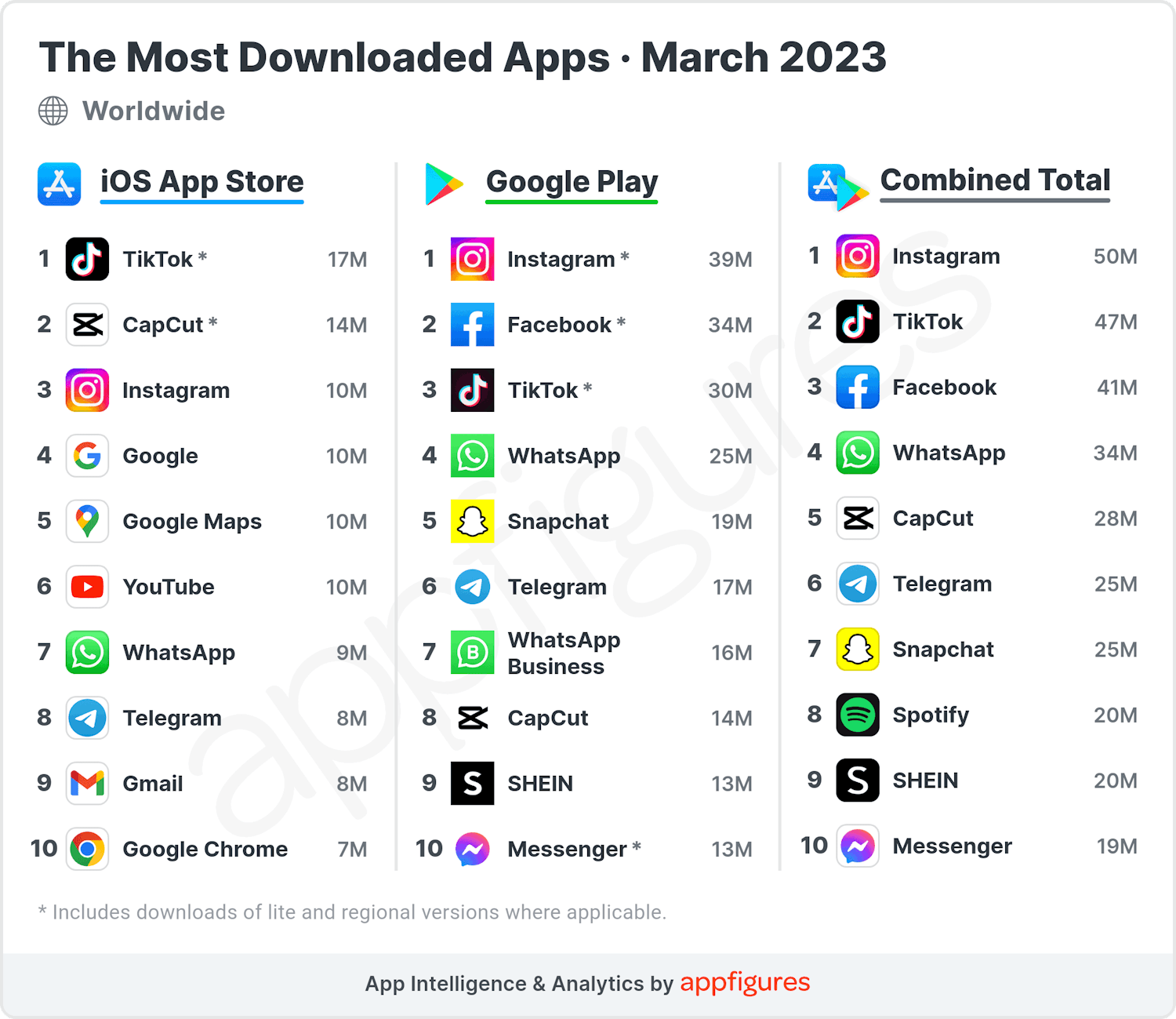 Il re delle app, come sempre, è Instagram con ben 50 milioni di download combinati. Tuttavia è una corsa molto vicina con TikTok, che peraltro l’ha sorpassato nell’App Store. Al secondo posto e quinto in totale vediamo una new entry: CapCut. Il motivo della sua popolarità è spiegato: Si tratta dell’editor di video ufficiale di TikTok, che ci si aspetta salirà ancora in futuro.