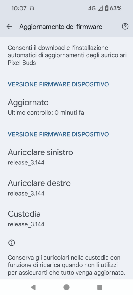 Attualmente, molti possessori dei Pixel Buds Pro 2 segnalano di aver ricevuto il nuovo firmware, ora disponibile in versione 3.144, mentre altri continuano a utilizzare la versione precedente 2.117. In redazione abbiamo ricevuto l’aggiornamento nella giornata di ieri, come mostra lo screenshot qui sotto.