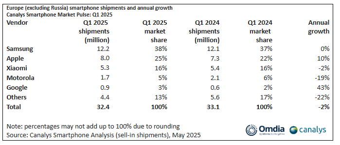 Nei primi mesi del 2025 il mercato europeo degli smartphone ha subito una nuova battuta d’arresto. Secondo i dati Canalys, le spedizioni complessive sono calate del 2%, segnando un rallentamento che colpisce soprattutto i modelli economici. A sorpresa, invece, le vendite dei dispositivi di fascia alta crescono e toccano un nuovo record, grazie all’effetto traino dei nuovi iPhone e Galaxy S25. Samsung mantiene la leadership, seguita da Apple, mentre Google entra per la prima volta nella top 5.
