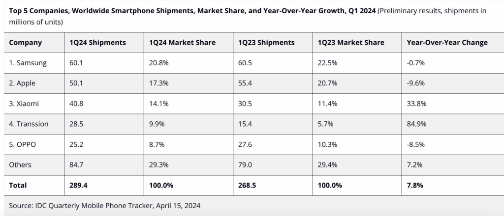 Secondo i dati preliminari di IDC, nel primo trimestre del 2024 le spedizioni globali di smartphone sono aumentate del 7,8% su base annua raggiungendo 289,4 milioni di unità.