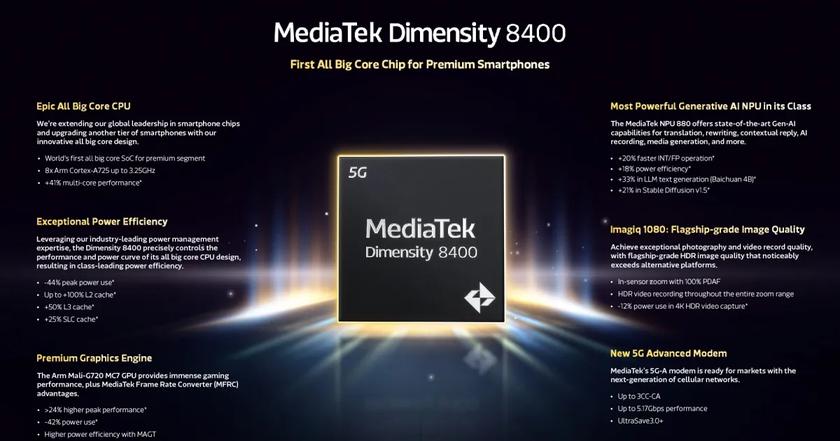 La GPU Arm Mali-G720 MC7 offre un aumento del 24% delle prestazioni di picco e una riduzione del 42% del consumo energetico. Sono state inoltre ottimizzate le latenze del touch. La NPU MediaTek 880 integrata nel Dimensity 8400 è il 20% più veloce nelle operazioni con numeri interi/virgola mobile (33% nella generazione di testo con modelli linguistici di grandi dimensioni), migliora l’efficienza del 18% ed è il 21% migliore anche in Stable Diffusion 1.5.