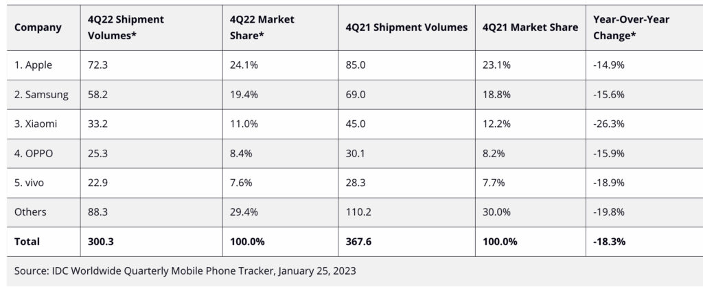Il mercato si è contratto del 18,3% totalizzando 300,3 milioni di spedizioni. Tutti e cinque i principali brand hanno registrato cali a due cifre su base annua rispetto al quarto trimestre del 2021.