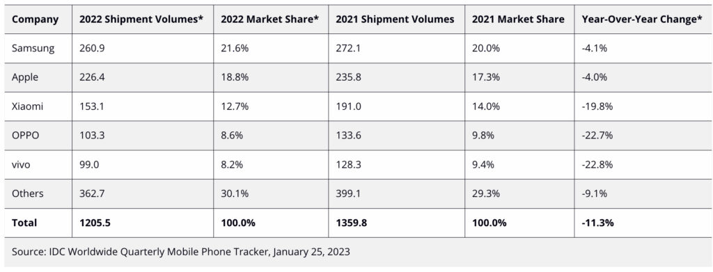 I dati di spedizione combinati per l’anno 2022 mostrano Samsung come leader con 260,9 milioni di unità e una quota di mercato del 21,6%. Apple è seconda con 226,4 milioni e il 18,8% del mercato mentre Xiaomi ha spedito 153,1 milioni di unità e detiene uno share del 12,7% del mercato.