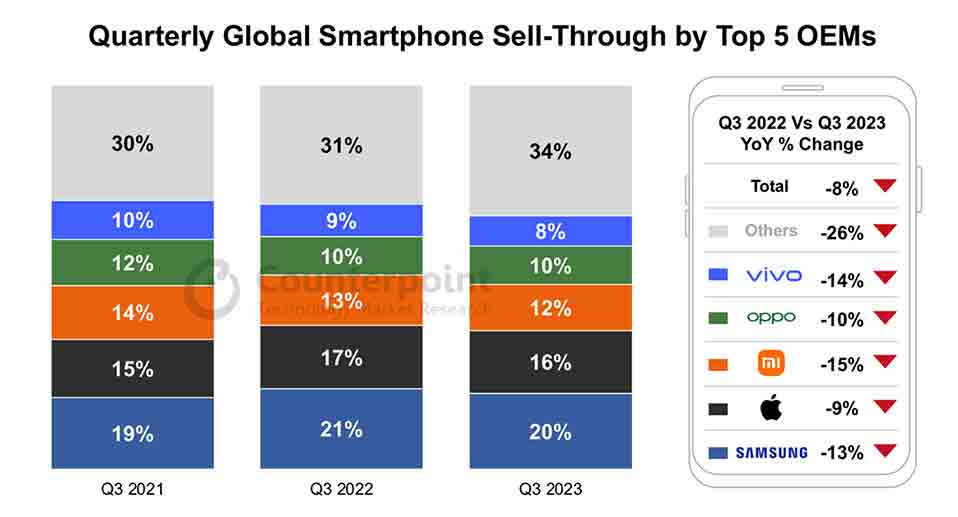 Honor, Huawei e Transsion Group (Tecno, Infinix, Itel) sono stati gli unici marchi che hanno registrato una crescita su base annua durante il terzo trimestre, mentre tutti i primi cinque marchi principali (esclusa Apple) hanno registrato cali a due cifre.