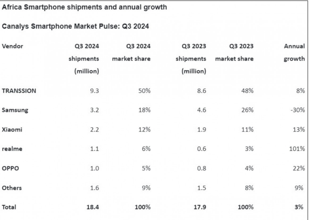 Transsion continua a dominare il mercato africano, detenendo una quota di mercato del 50% e registrando una crescita costante dell’8% nonostante le difficili condizioni di mercato. Le spedizioni di Samsung sono diminuite del 30% a causa della bassa domanda in Sudafrica, uno dei mercati più importanti per l’azienda nel continente, per una market share del 18%.