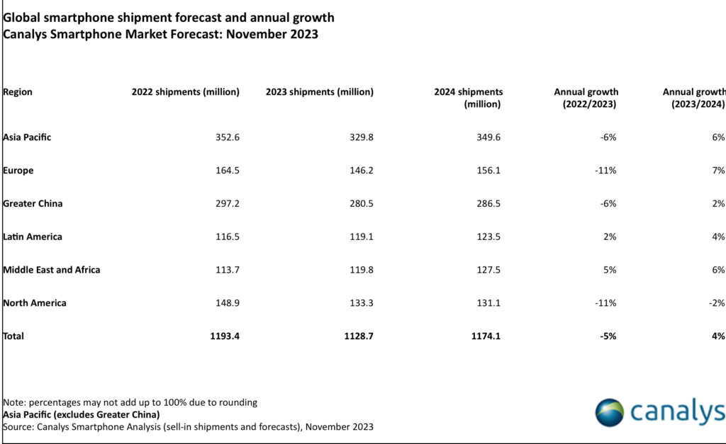 Nel complesso, nel 2023 verranno spediti 1,13 miliardi di smartphone, cifra che dovrebbe crescere del 4% per raggiungere 1,17 miliardi di unità nel 2024.