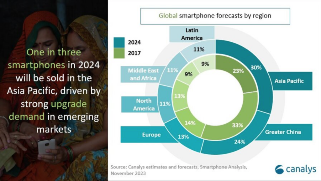 “Uno smartphone su tre spedito nel 2024 sarà acquistato nell’Asia Pacifico, rispetto a solo uno su cinque nel 2017. Questa regione sarà anche testimone di una delle crescite più rapide, pari al 6% su base annua, guidata dalla ripresa della domanda in India, Sud-est asiatico e Asia meridionale. Man mano che le condizioni macroeconomiche e la fiducia dei consumatori in questi paesi si stabilizzeranno, l’aggiornamento degli smartphone accelererà”.