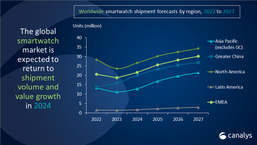 Nel 2024, quindi, ci si può aspettare una grande crescita nella domanda per gli orologi avanzati. Questi si diffonderanno principalmente nei mercati di regioni emergenti come Medio Oriente e Europa centrale. Molti utenti, infatti, saranno pronti a fare l’upgrade a modelli dotati di tecnologie più potenti.