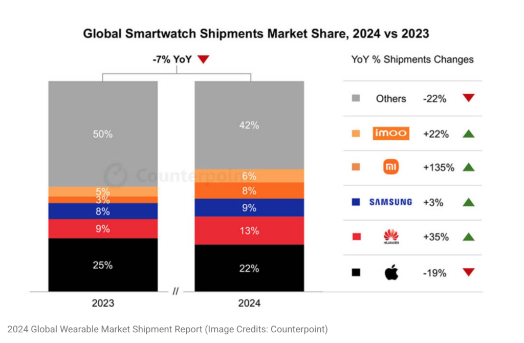 Samsung ha registrato un aumento del 3% grazie alla popolarità dei Galaxy Watch 7, Galaxy Watch Ultra e Galaxy Watch FE. Xiaomi è il marchio in più rapida crescita nel mercato globale dei dispositivi indossabili 2024 e ha ottenuto un aumento delle vendite anno su anno del 135%. Imoo ha una quota del 22% anno su anno.