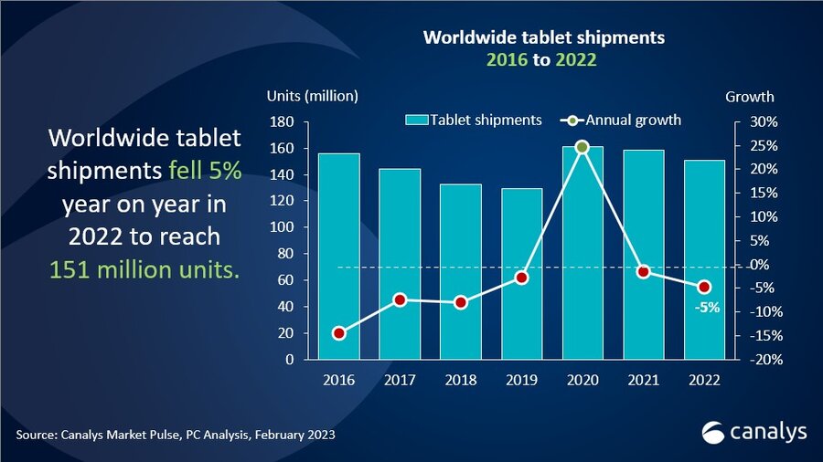 Le spedizioni mondiali di PC (compresi i tablet) sono diminuite del 21% su base annua nel quarto trimestre del 2022, con 105,6 milioni di unità. Nel 2022 sono state 434,5 milioni le unità distribuite, con un calo del 13% rispetto al 2021. Il mercato dei tablet – pur in un contesto di ribassi- sembra tenere e, nel Q4/2022, ha registrato una crescita dell’1% con 42,3 milioni di unità. Il 2022 si è tuttavia concluso con un totale di 150,8 milioni di tablet spediti, in calo del 5% rispetto al 2021.