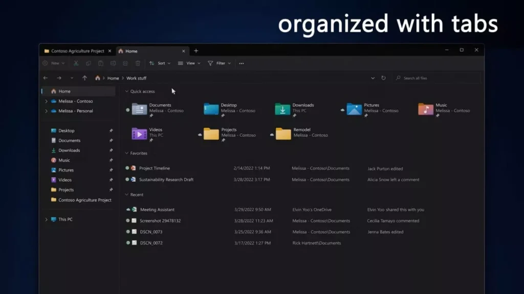 Ma soprattutto, questa nuova versione introduce la gestione delle schede in Esplora file. Come un browser web, sarà possibile passare velocemente da una cartella all’altra semplicemente cambiando le schede. Microsoft suggerirà automaticamente i contatti anche nel menu di condivisione file, in base alle proprie abitudini.