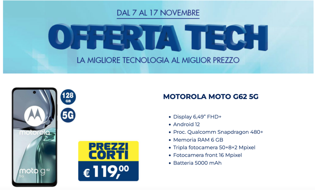Il volantino Esselunga, che come sempre è ad esaurimento scorte, offre il Motorola Moto G62 5G a 119 euro.
