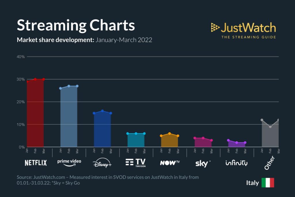 Netflix ha guadagnato infatti l’1% di quota di mercato nel primo trimestre del 2022, consolidando il suo vantaggio del 3% su Prime Video. Disney+ registra una perdita del 2% pur mantenendo un vantaggio del 9% su TimVision.
