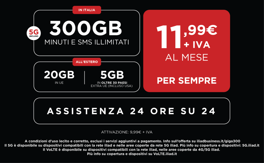 Anche iliadbusiness si rinnova e, senza aumenti di prezzo, l’offerta passa da 220GB a 300GB al mese pernavigare, sempre con minuti ed SMS illimitati e 16GB per l’Europa e 5GB in oltre 30 Paesi Extra UE, inclusi gli Stati Uniti.