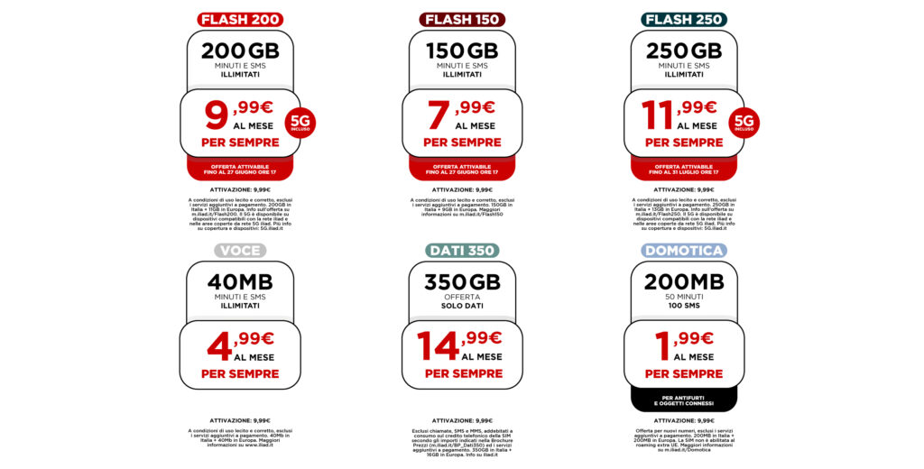 • Pacchetti voce e dati ricchi di giga e con minuti ed SMS illimitati (FLASH 250, FLASH 200, FLASH 150). Queste offerte sono disponibili anche per gli attuali utenti che desiderano aumentare la propria disponibilità di GB.