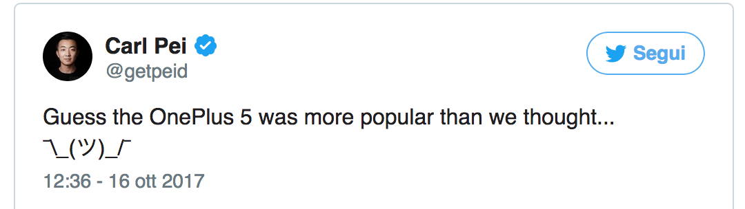 Sarà necessario attendere le prossime ore per capire come la società orientale intenderà muoversi. Tuttavia qualcosa si intuisce. Un tweet di Carl Pei, CEO di OnePlus, sembra candidamente ammettere che onePlus 5 sia semplicemente esaurito perché il successo ottenuto sul mercato è stato maggiore rispetto alla capacità produttiva.