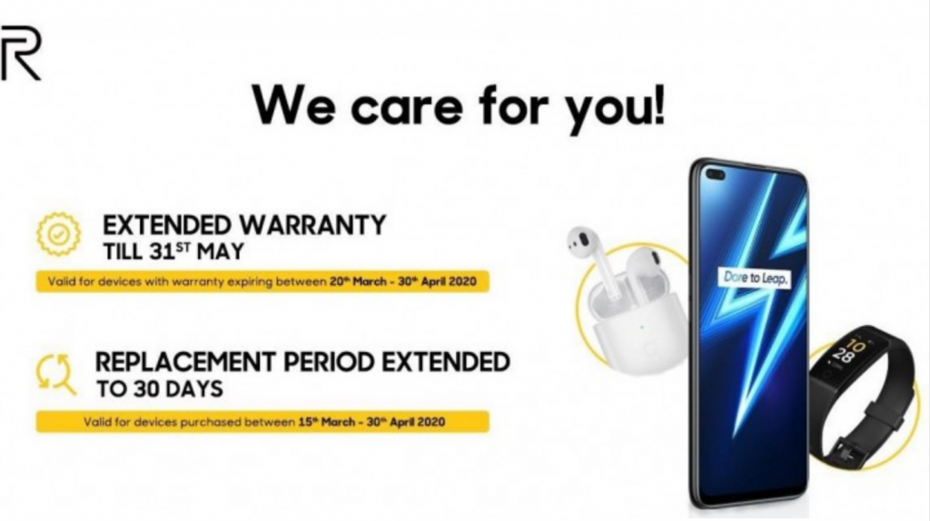 La filiale indiana di Realme ha esteso la garanzia fino al 31 maggio 2020 per quei prodotti le cui garanzie scadrebbero tra il 20 marzo 2020 e il 30 aprile 2020. Inoltre, la società cinese ha esteso il periodo di sostituzione a 30 giorni per i prodotti acquistati tra il 15 marzo e il 30 aprile 2020.