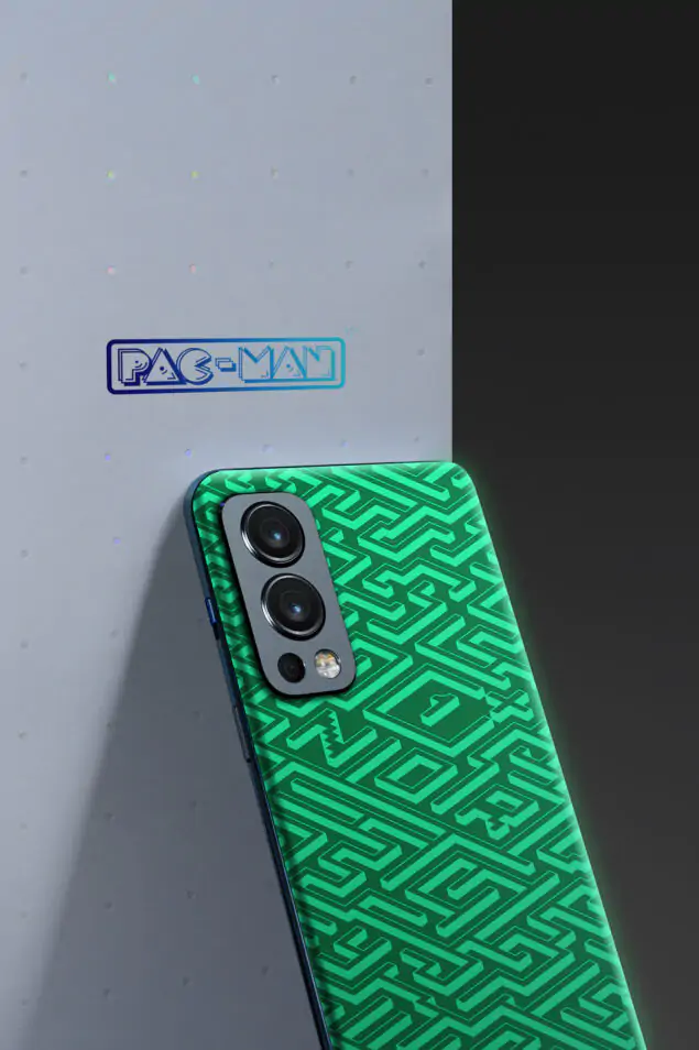 Come si può ben vedere, il design di OnePlus Nord 2 PAC-MAN Edition spicca per la cover posteriore a doppia pellicola, in cui sono incorporati i design di entrambi i marchi. C’è di più: lo strato più interno è fosforescente al buio, svelando un labirinto ispirato alla famosa mappa del gioco. Anche lo slider per le notifiche è personalizzato: è di colore blu scuro, lo stesso dei fantasmini quando PAC-MAN mangia un Power Pellet.