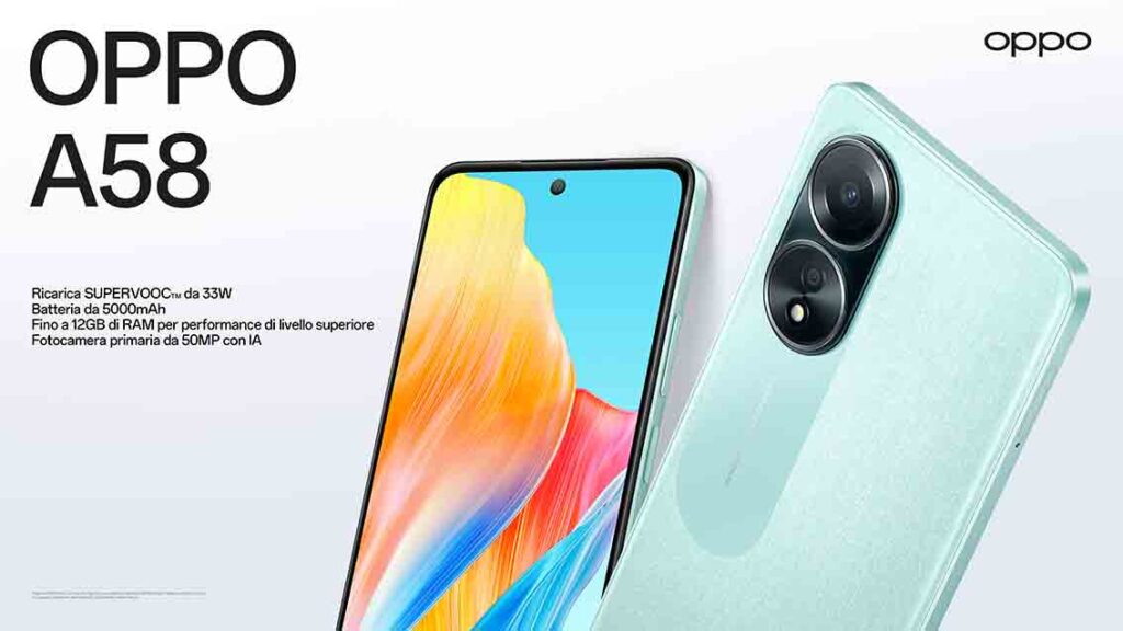 OPPO ha annunciato il lancio del nuovo modello di smartphone OPPO A58. Il dispositivo, che va a integrare la gamma di modelli della Sieria A, è dotato di un display Sunlight FHD+ da 6,72 pollici, offre due altoparlanti stereo e la tecnologia di ricarica SUPERVOOC da 33W, abbinata a una potente batteria da 5000mAh.