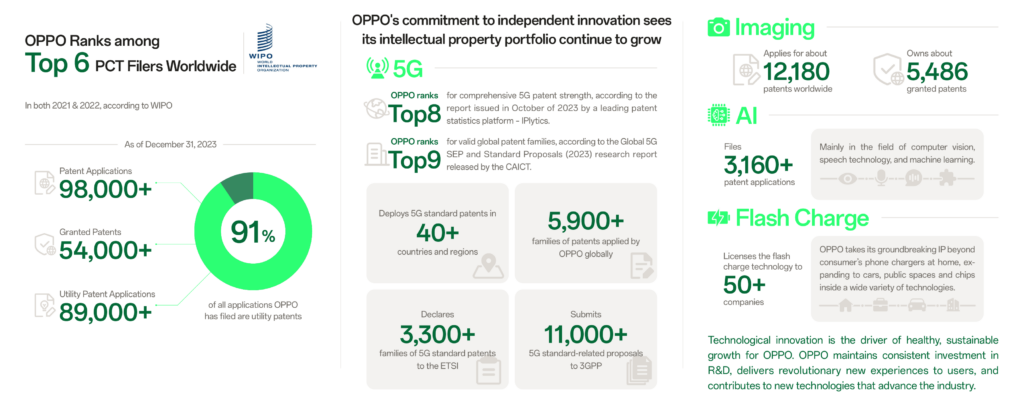 Al 31 dicembre 2023, OPPO ha implementato brevetti standard per la comunicazione 5G in oltre 40 Paesi e regioni, con un totale di oltre 5.900 famiglie di brevetti a livello globale, oltre 3.300 brevetti standard 5G dichiarati a ETSI e oltre 11.000 documenti standard presentati a 3GPP. Secondo il rapporto 5G del 2023 pubblicato dalla China Academy of Information and Communications Technology (CAICT) e un rapporto di IPlytics pubblicato in ottobre 2023, OPPO si posiziona tra le prime aziende a livello globale in termini di forza del proprio portfolio brevetti essenziali per lo standard 5G.