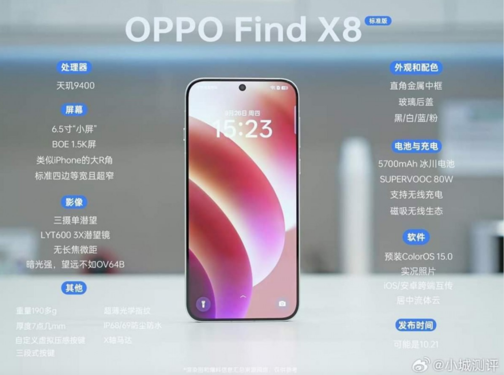 Il foglio delle specifiche trapelate fornisce interessanti novità. Il modello base Oppo Find X8 sarà dotato di un display OLED da 6,5 pollici, prodotto da BOE, e sarà alimentato da un processore Dimensity 9400, ancora non annunciato.