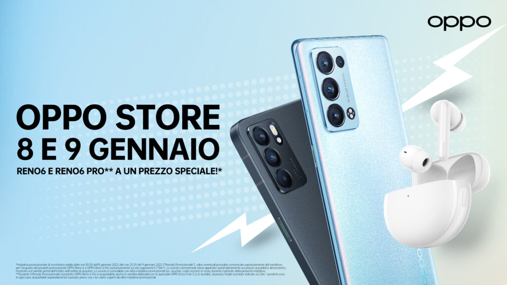 Nelle giornate dell’8 e del 9 gennaio, solo su OPPO Store, Reno6 Pro sarà infatti disponibile con gli auricolari wireless Enco Free2 a 699,99 euro; Reno6 5G a 399,99 euro invece di 499,99 euro.