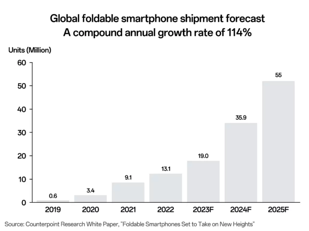 La performance di OPPO è stata alimentata in parte dal successo degli smartphone pieghevoli. Secondo le stime di Counterpoint Research, le spedizioni globali di smartphone pieghevoli dovrebbero crescere a un tasso annuo composto del 114% dal 2019 al 2025, quadruplicandosi tra il 2022 e il 2025 fino a raggiungere 55 milioni di unità.