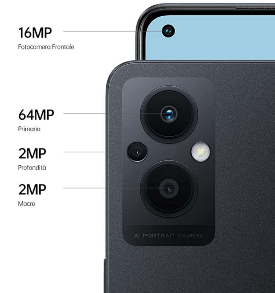 Reno8 Lite 5G dispone di una tripla fotocamera, con un’ottica principale da 64 Megapixel, una macro da 2 Megapixel e una di profondità da 2 Megapixel. Sulla parte frontale del telefono, invece, troviamo un sensore da 16 Megapixel, i cui scatti sono supportati da una serie di modalità come Selfie HDR, AI Palette, AI Color Portrait e Portrait Retouching.
