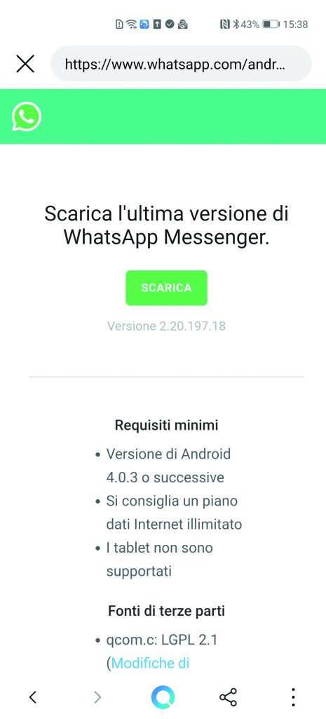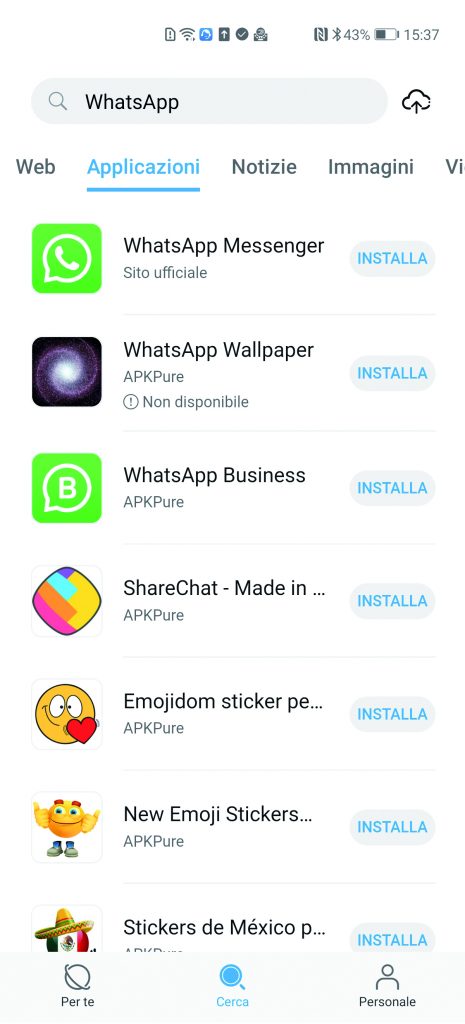 Abbiamo fatto una semplice ricerca con la chiave “Whatsapp”. Il sistema ci ha restituito i siti dove scaricare l’applicazione dando la precedenza al sito ufficiale dello sviluppatore e, in seconda battuta, ad altri store come Apk Pure.