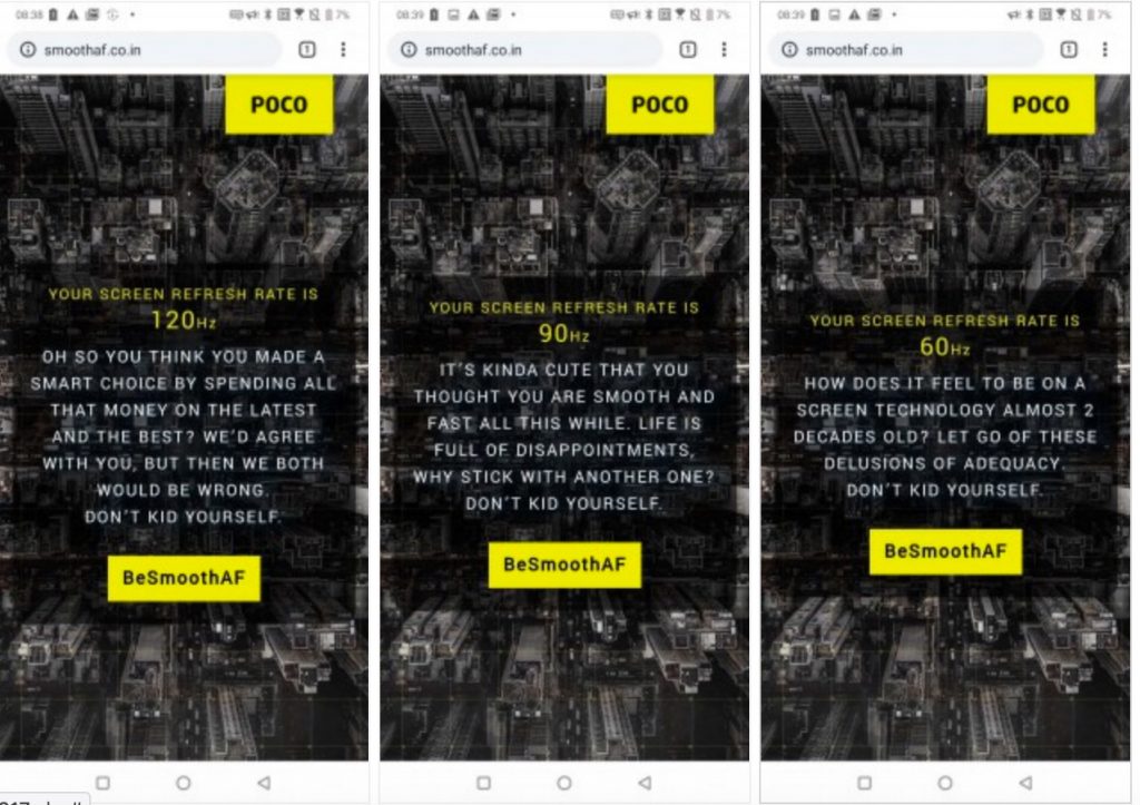 L’invito di Poco è quello di visitare il link smoothaf.co.in dal cellulare perché tale visualizzazione permette di pubblicizzare al meglio la dote del nuovo smartphone, ossia quello del refresh del display a 120 Hz.
