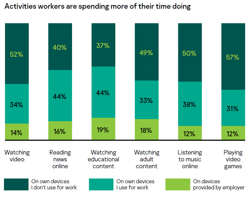 Ci sono, naturalmente, altri cambiamenti di abitudini. Ad esempio, il 66% dei dipendenti italiani intervistati (55% a livello globale), ha dichiarato di leggere più notizie in questo periodo di quanto non facesse prima. Sebbene questo si possa spiegare con la volontà delle persone di rimanere aggiornate sulla pandemia, questa attività viene svolta nel 45% dei casi su dispositivi utilizzati per il lavoro (60% guardando ai numeri a livello globale). Questa abitudine però può comportare dei rischi per la sicurezza informatica come ad esempio quello di infezioni da malware, per cui è importante che i dipendenti prestino molta attenzione alle risorse web visitate.