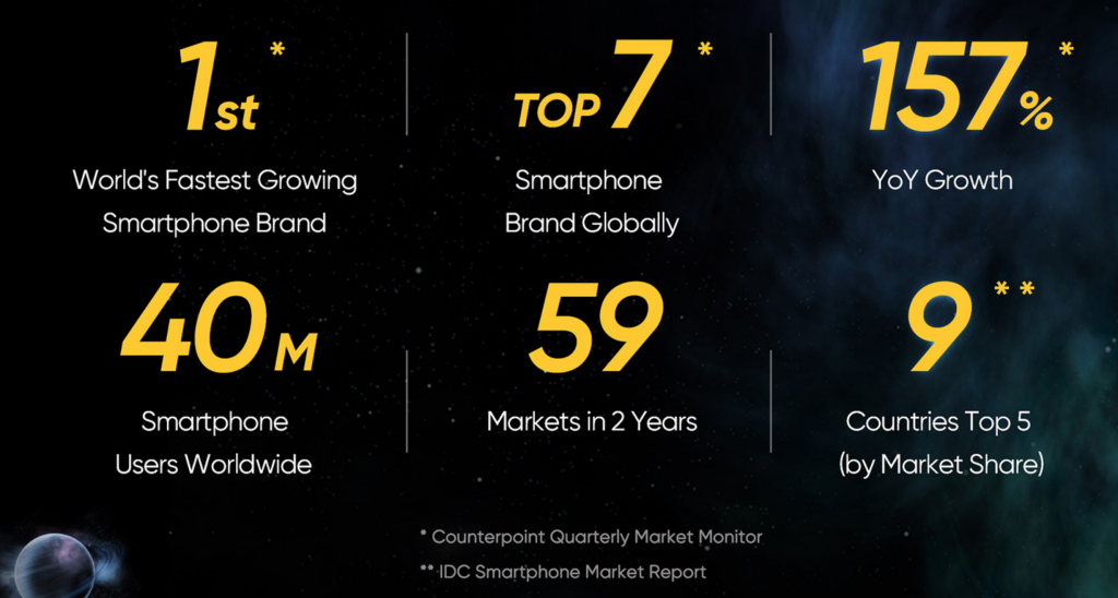 realme è al momento tra i primi 4 marchi di smartphone in Thailandia, India, Cambogia ed Egitto, e ha raggiunto la top 5 in Myanmar, Filippine, Ucraina, Indonesia e Vietnam.