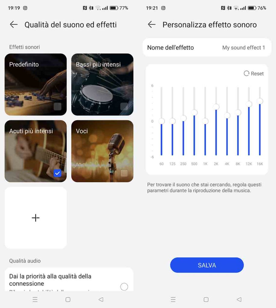 C’è un menù con le impostazioni di equalizzazione predefinite: qui è presente una nuova funzionalità: si può impostare manualmente l’equalizzazione a 10 bande e aggiungere le proprie impostazioni audio. È anche possibile abilitare le chiamate HD e scegliere di dare priorità alla qualità del suono rispetto alla qualità della connessione o viceversa.