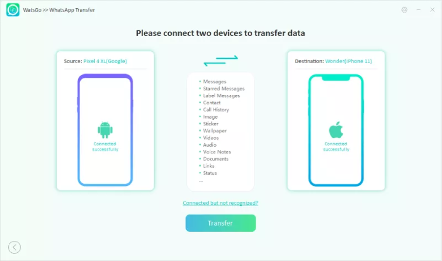 2. Trasferisci tutti i dati in modo sicuro: Il software ti consente di trasferire oltre 20 tipi di dati senza alcuna perdita nella loro interezza. Puoi trasferire e condividere messaggi, immagini, audio, stato, contatti, documenti, adesivi, link, messaggi con etichetta, cronologia delle chiamate, video, sfondi e altro ancora, senza lasciare nulla indietro.